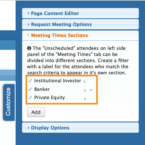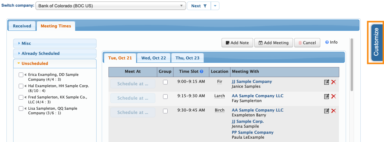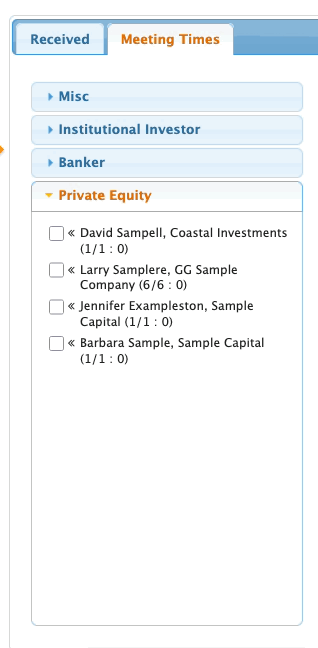You’ll create categories and work with them on the Meeting Times page. You can reach it from either the Attendee List or Company List: