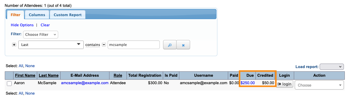 On the Attendee List, you can add the Credited and Due columns to easily see balance adjustments: