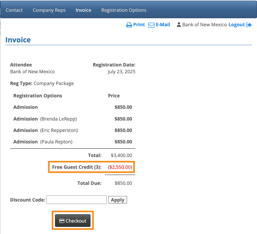 Here, the Company has added 3 Company Reps. Their names appear on the invoice, and MeetMax applies a credit for their admission, so they’ll attend for free: