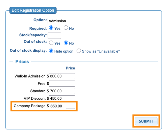 Here, we’re editing our existing “Admission” Registration Option. It displays all of our event’s Registration Types, including the one we just created. So we’ll add this Company price there.