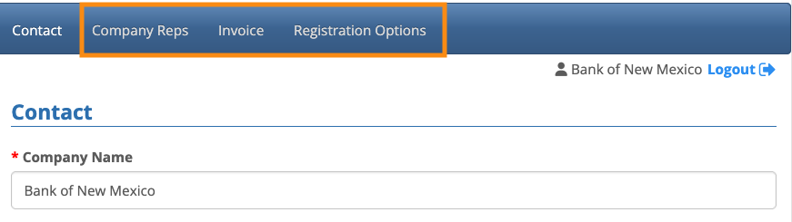 Once a Company’s main contact finishes registration, they’ll be taken to their organization’s MeetMax account. They’ll see the Company Reps, Registration Options and Invoice tabs, plus any other tabs you’ve granted access to before payment: