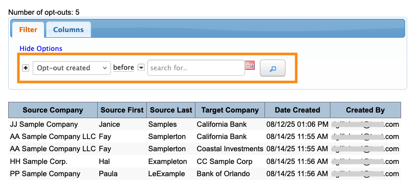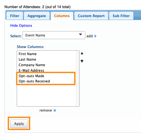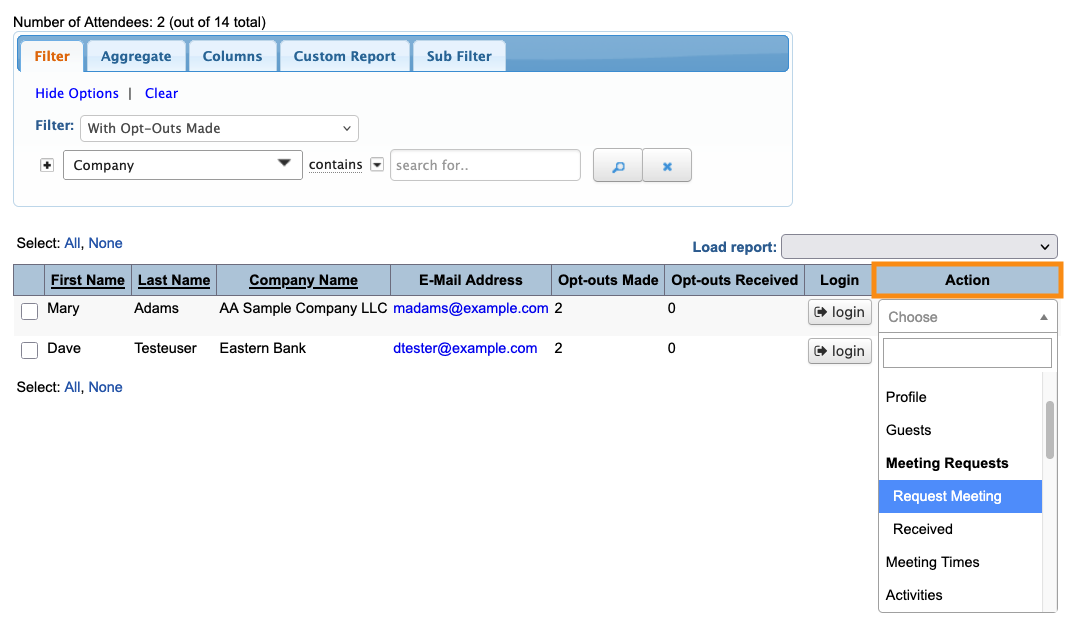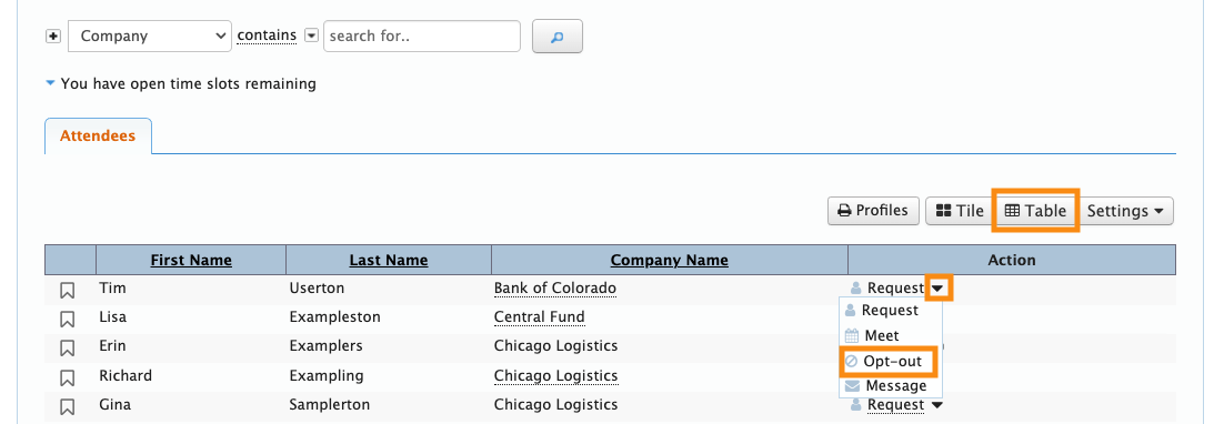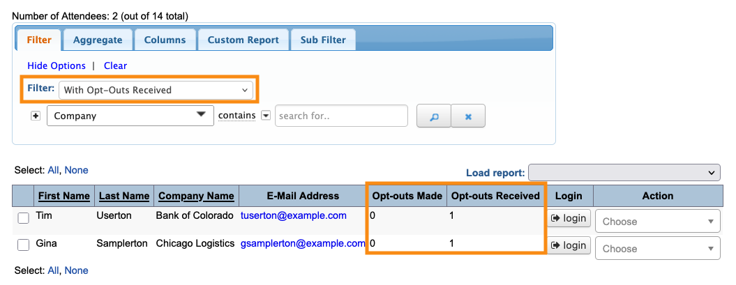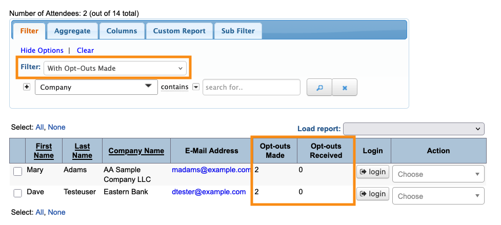 When you enable opt-outs, MeetMax adds two filters to both the Attendee List and Company List: