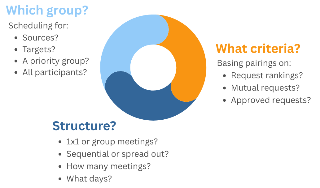 - The order of automation passes is important. With each pass you run, you’re reducing the availability of participants, time slots, and meeting locations. So run your highest-priority groups first! Use our Pre-flight questions to help you establish your priorities.