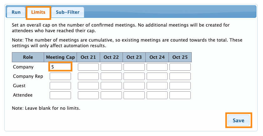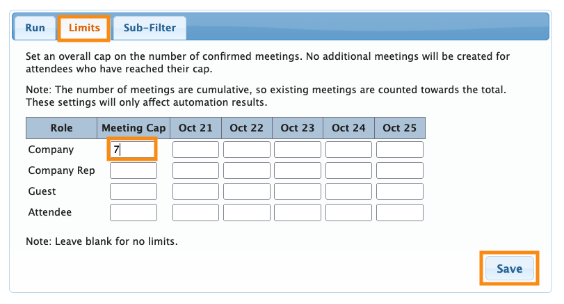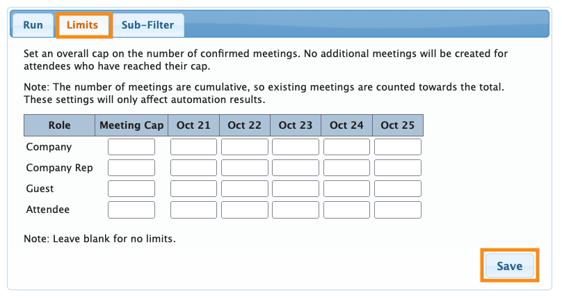 - Step 5. Head to the Limits tab. Remove the Limits you set before. That way, MeetMax can create as many meetings as possible for each Company: