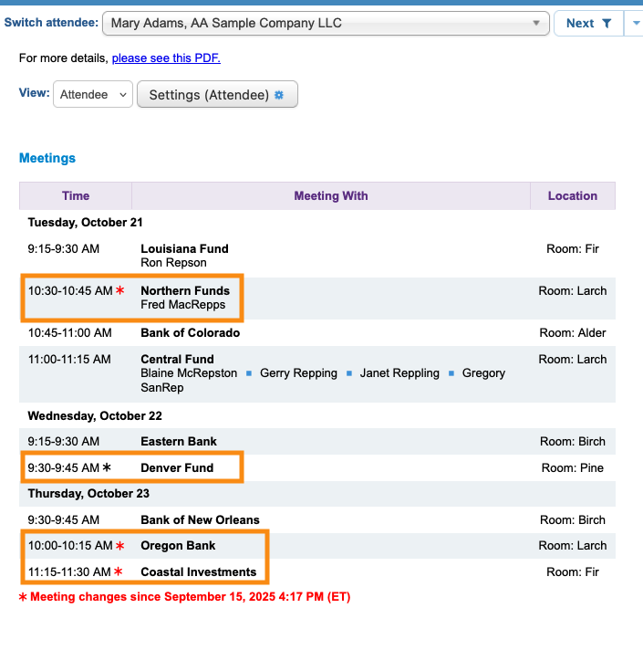 Here’s the same Attendee’s schedule, with recent changes highlighted: