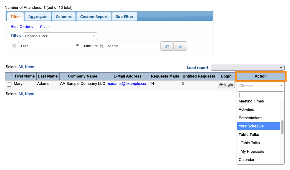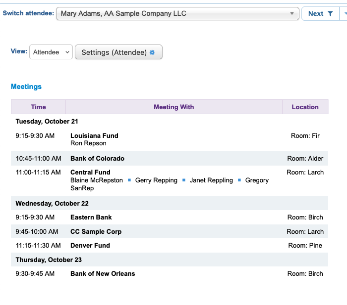 | We’ll show the Admin view of an Attendee schedule here. Remember, you can also preview what the Attendee sees in their account. |