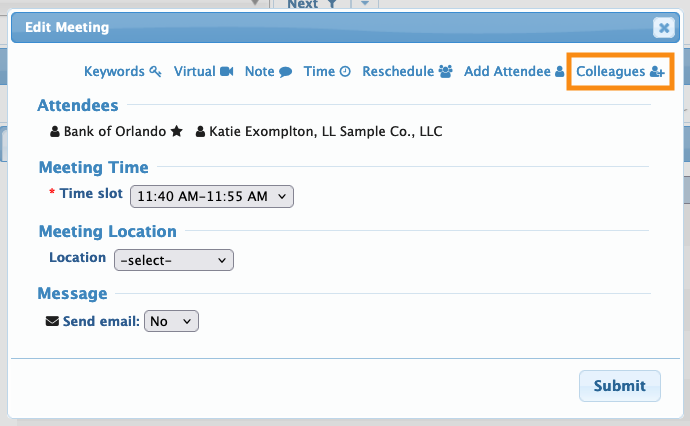- If your event doesn’t automatically include Company Reps in all meetings, you can add them individually as Colleagues.