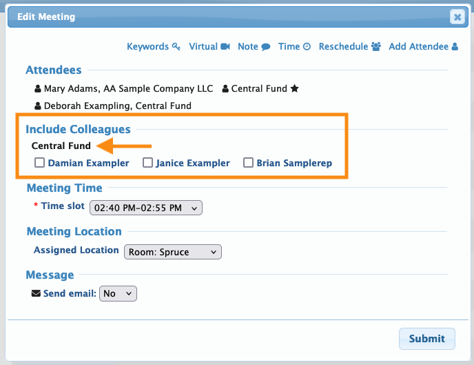 - Step 4. When you click the Colleagues link, you can add any of Central Fund’s other Reps to this meeting: