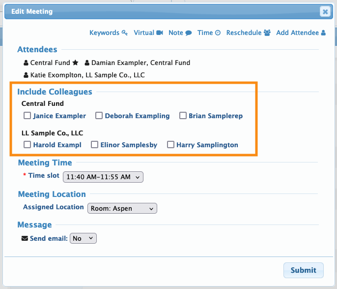 In this example, Central Fund has a meeting booked. One of its Reps, Deborah Exampling, was added to this meeting automatically. We want to add more Colleagues.