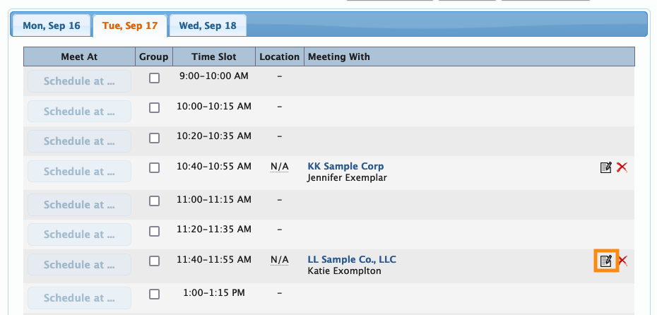 - Step 2. Filter the list to find the company whose meeting you need to update. Then use the Action menu to choose Meeting Times: