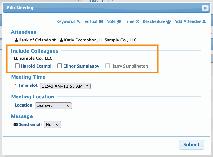 In this example, Katie Exomplton is an Attendee who has several colleagues at the event. Katie has a meeting scheduled with a Company, Bank of Orlando. She wants to have her colleagues added to this meeting.