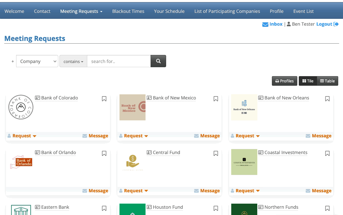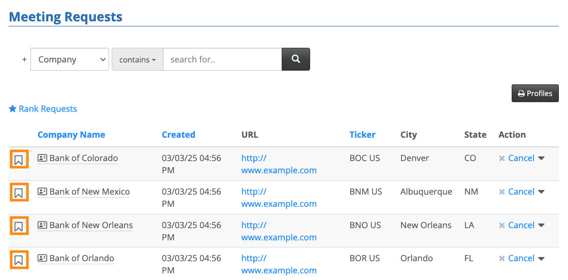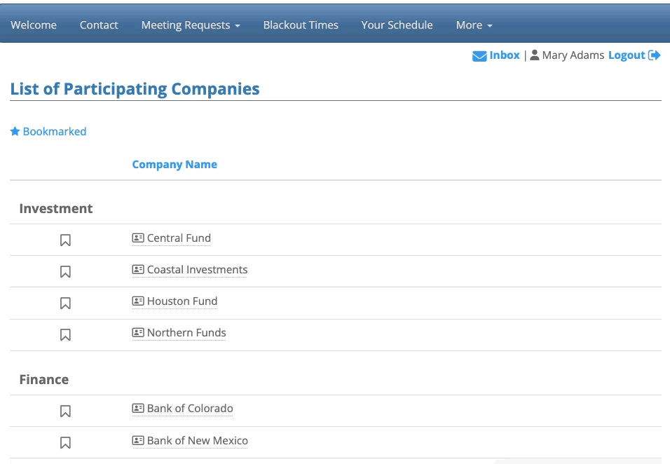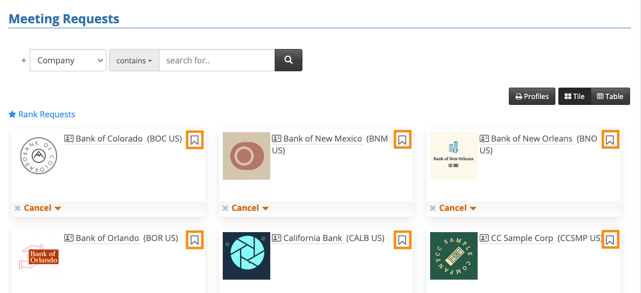 On the Meeting Requests page, participants can add bookmarks. Then, they can filter the page to display only those people/companies: