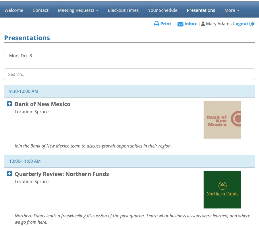 Here’s what a logged-in Attendee would see from the Presentations page. In this example, we previously bookmarked Northern Funds on another page, so we can also see that here in their Profile: