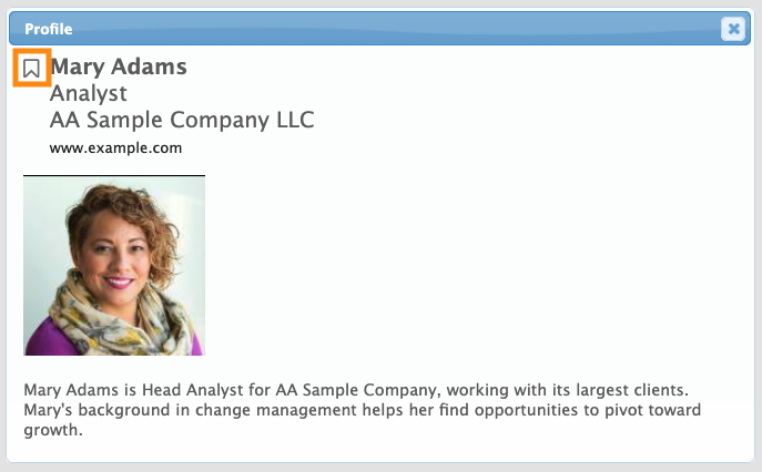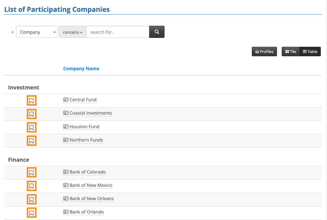 As an option, your event can display Attendee and/or Company names as links. Those links open a participant’s Profile in a pop-up, which includes the bookmark icon: