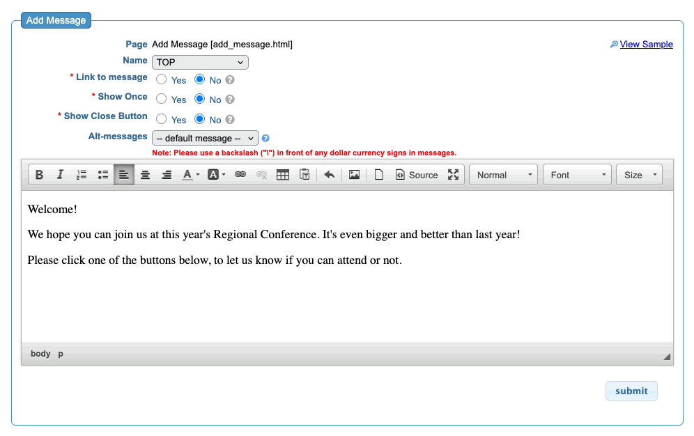 - You can return to this Message at any point during your event, and change the content. Participants will see the new version automatically.