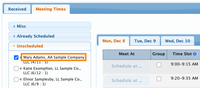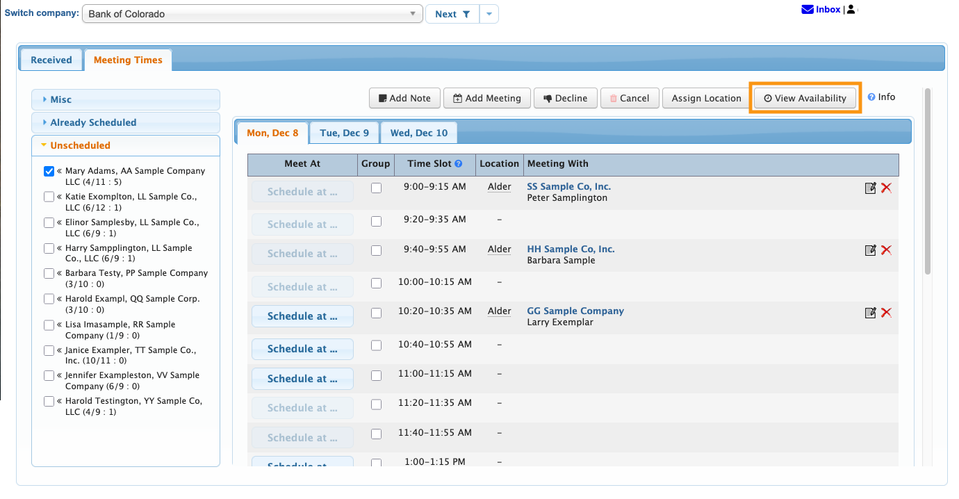 - Mary Adams has requested a meeting with this Company, but when we try to schedule it, we notice that she has limited availability. (Below, you can see that very few Schedule At buttons are clickable.)