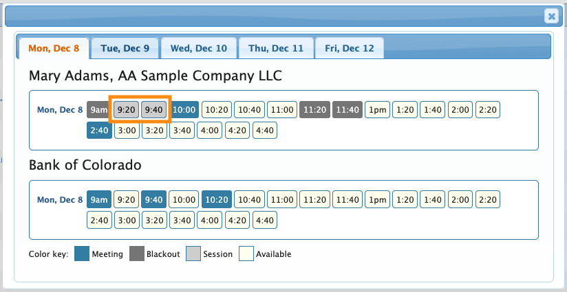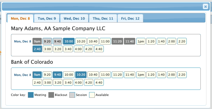 - The color key along the bottom tells you what’s happening in the unavailable time slots. (Session indicates that Mary has either a presentation or an activity at that time. More on this below.)