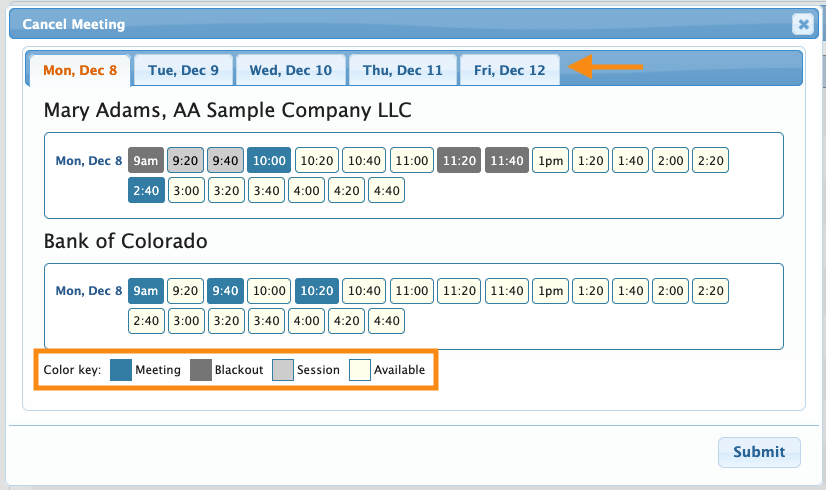 - The color key along the bottom tells you what’s happening in the unavailable time slots. (Session indicates that Mary has either a presentation or an activity at that time. More on this below.)