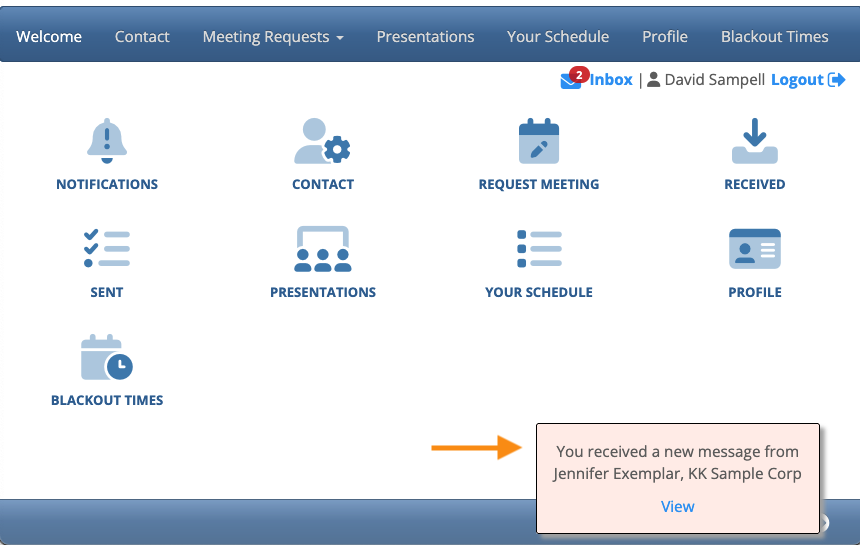 | Participants must be logged into MeetMax to see these pop-ups. If they receive messages while they’re logged out, MeetMax will place those messages into the Inbox. |