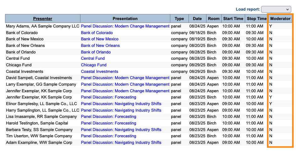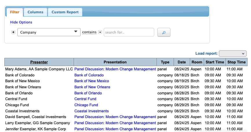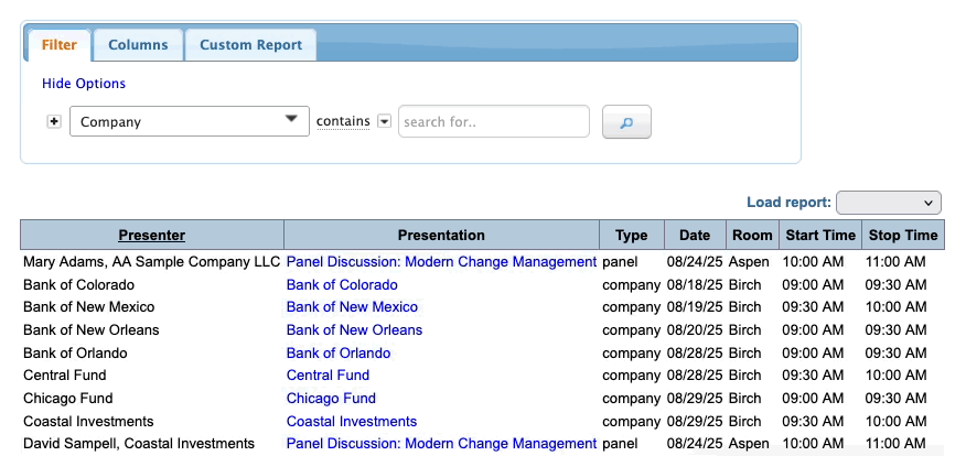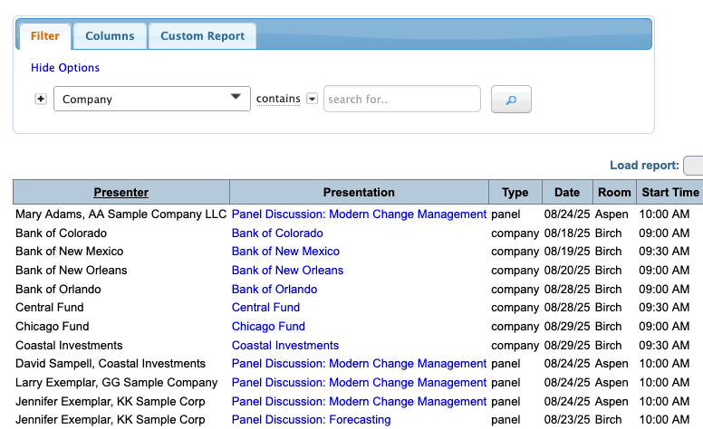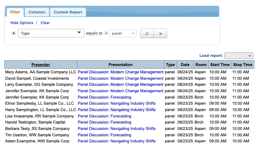 If Companies, Company Reps, or Attendees are presenters at your event, you can run a report of all presenters, or filter it by day or presentation.