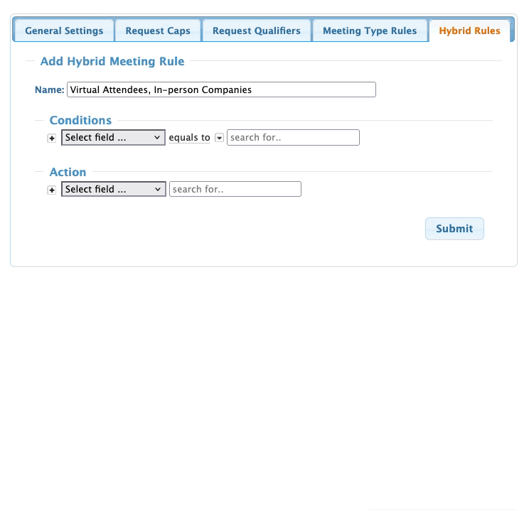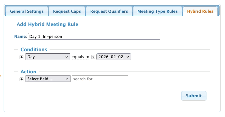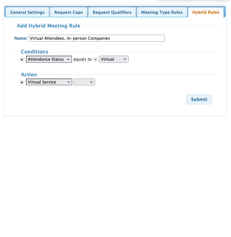 Once you’ve created your first rule, the Hybrid Meeting page looks like below.