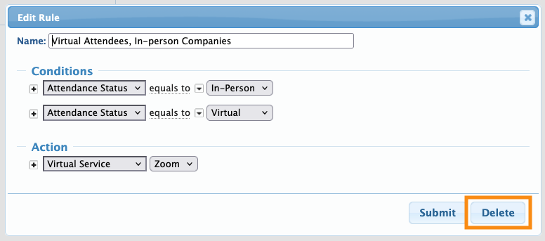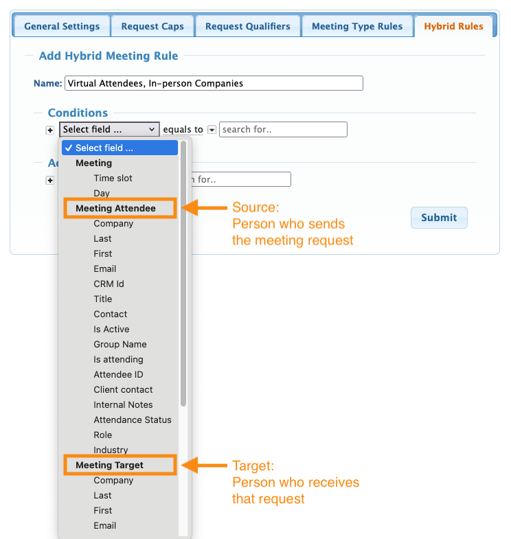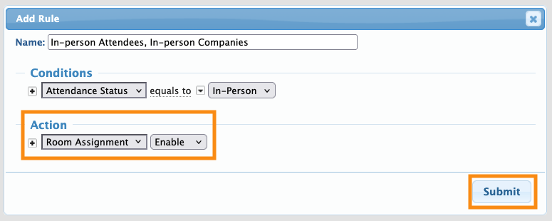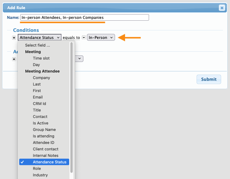 - Because both the Meeting Attendee and Meeting Target are in-person, this rule only needs one Condition: