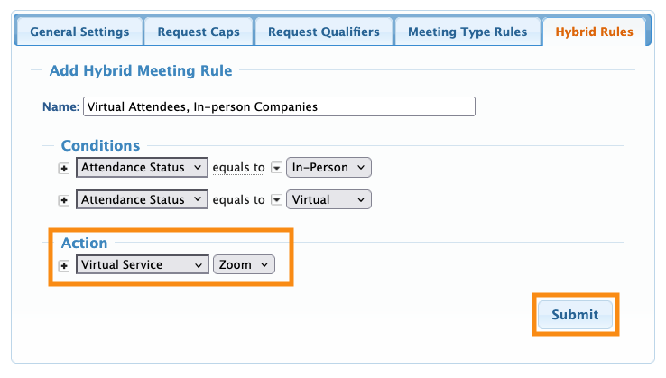 In addition to the above setting, our Support team needs to enable your event for virtual meetings. You can use Hybrid Meeting Rules whether you’re contracting Zoom rooms from MeetMax, or providing your own virtual rooms.