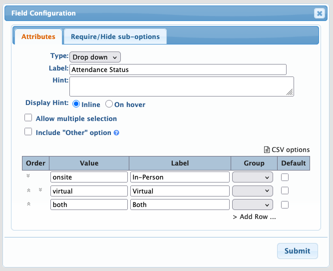 - Add the field to your public registration forms, and let participants choose their own type of attendance.