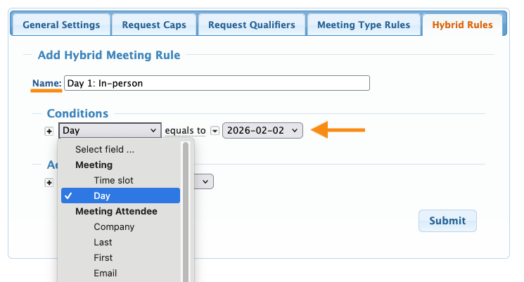- With this rule in place, all meetings on Day 1 will automatically be considered in-person meetings. MeetMax will let you assign meeting locations to them.