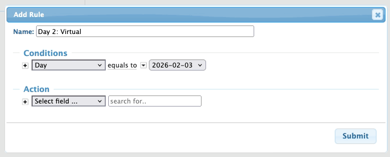 - Step 5. Since Day 2 of our event is virtual, we’ll create a second rule.