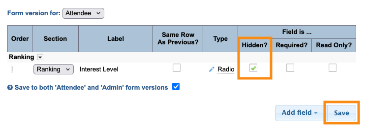 - For any fields that are present, click the Hidden checkbox. Then click Save: