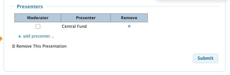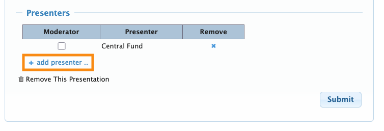 - Step 3. You’re now in the Add Presentation form. Scroll down to the Presenters section. Click the Add Presenter link: