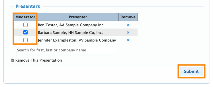 If you need to add an Attendee or Company Rep as a presenter and you’re not seeing that option here, reach out to our Support team. - Step 4. To make any presenter a moderator, click the checkbox: