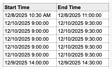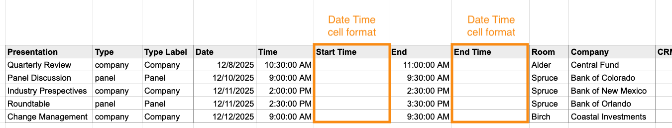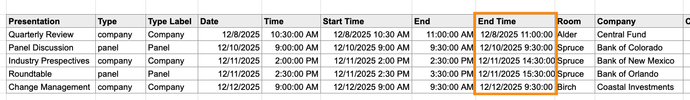 Don’t delete the original, separate columns! The formulas you’ve just built are dependent on them. If you delete the original columns, the new ones will break. (Don’t worry, we’ll deal with the original columns in a moment.) To make the next steps simpler, we recommend changing your original (separate) column titles as needed, so it’s clear which ones are the new Start Time and End Time columns. - Step 5. Export your spreadsheet as a CSV file. Then start importing the presentations to MeetMax.