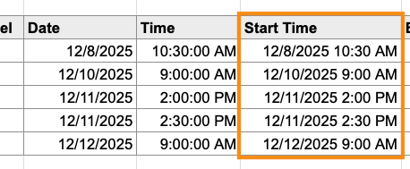 - When you save this formula and replicate it in the rest of the column, you’ll see all the combined start dates and times: