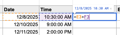- Step 3. Let’s combine the start date and time first. In the first cell of your new Start Time column, add a formula that references the Date column + the Time column: