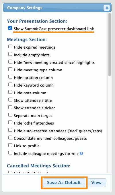 - Step 4. In the Attendee Settings pop-up, check the box for Show SummitCast presenter dashboard link.