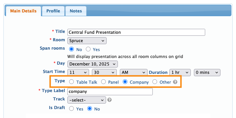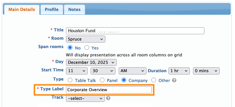 Here’s an example, where our event will have more than one kind of Company presentation. So we’ll add Type Labels to differentiate them: