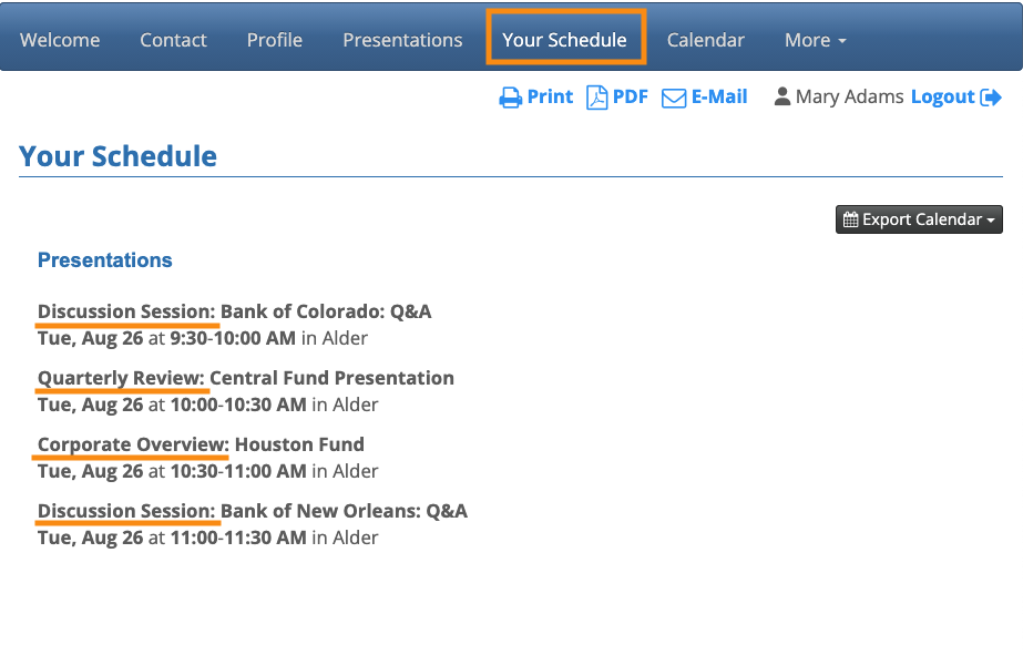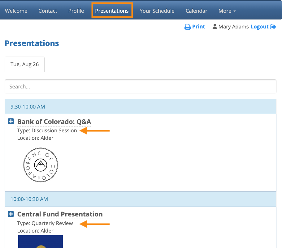 Once a participant signs up for a presentation, they’ll see the Type Label on their schedule. It’s part of the presentation title.