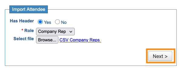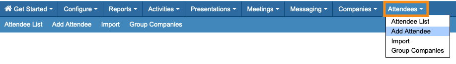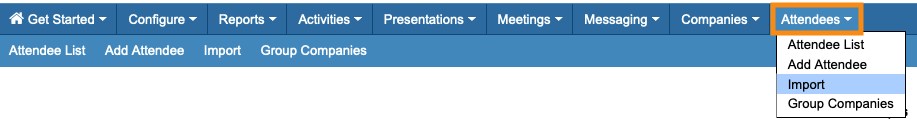 You’ll start a Company Rep import from the Attendees tab. (Company Reps are a type of Attendee in MeetMax.)