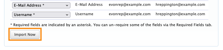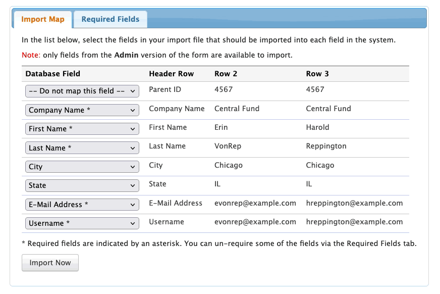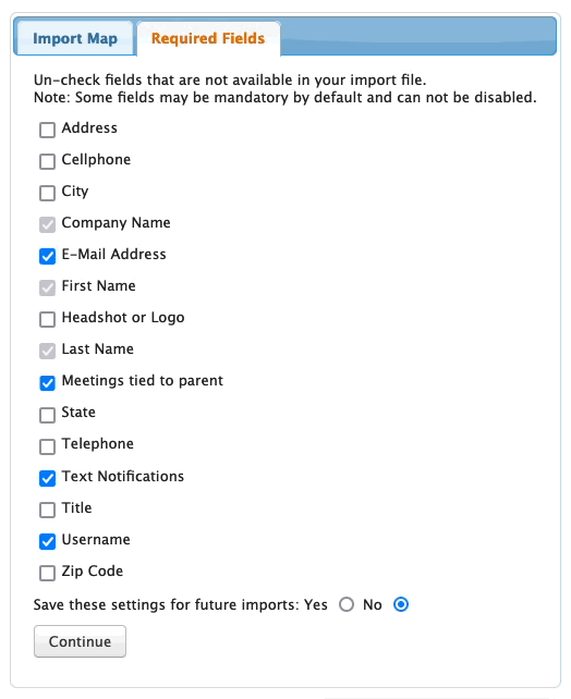 - Step 6. Next, click on the Required Fields tab. All of the required fields in your registration form will be checked here. You can uncheck any of the boxes to remove that requirement during this import.