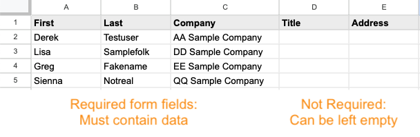 - You can leave some cells in your spreadsheet empty, and add that data later. The only exception is with Required form fields (see below).