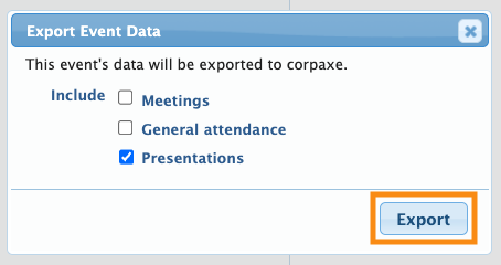 - You can send data to Corpaxe multiple times. Details change throughout your event, so you can export any time you need to update Corpaxe. Each export overrides the previous one.