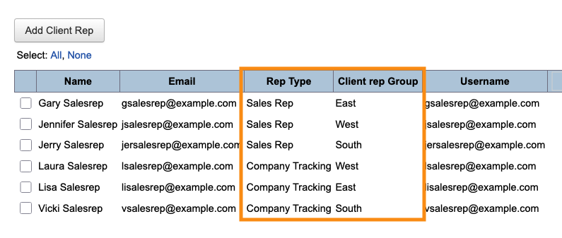 In the example above, each of these Client Reps is a Sales Manager. We’ve assigned each one to a Client Rep Group. Now we can add their individual sales teams as Client Reps as well, and add them to their groups. |