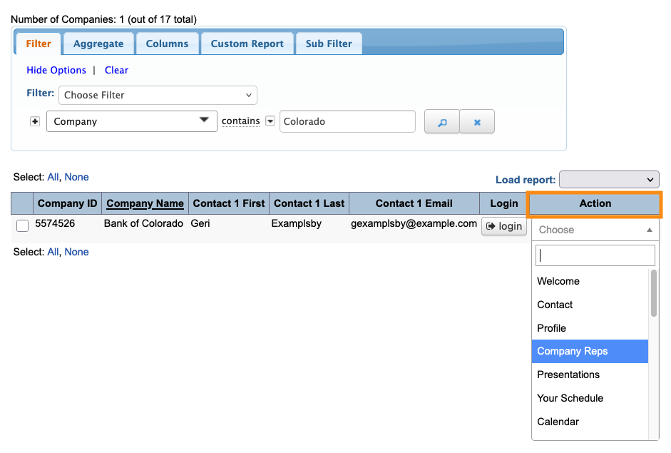 Filter the list to locate the Company you need. Then use the Action menu to choose Company Reps:
