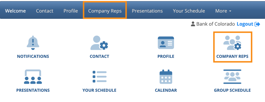 If your event’s participating Companies are adding their own Company Reps, the Company Contact logs into MeetMax, and chooses Company Reps: