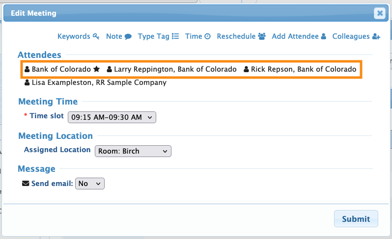 By default, MeetMax “ties” all Company Reps to their parent company. This means that whenever you schedule a meeting for the Company, all of the Reps are automatically scheduled into that meeting.