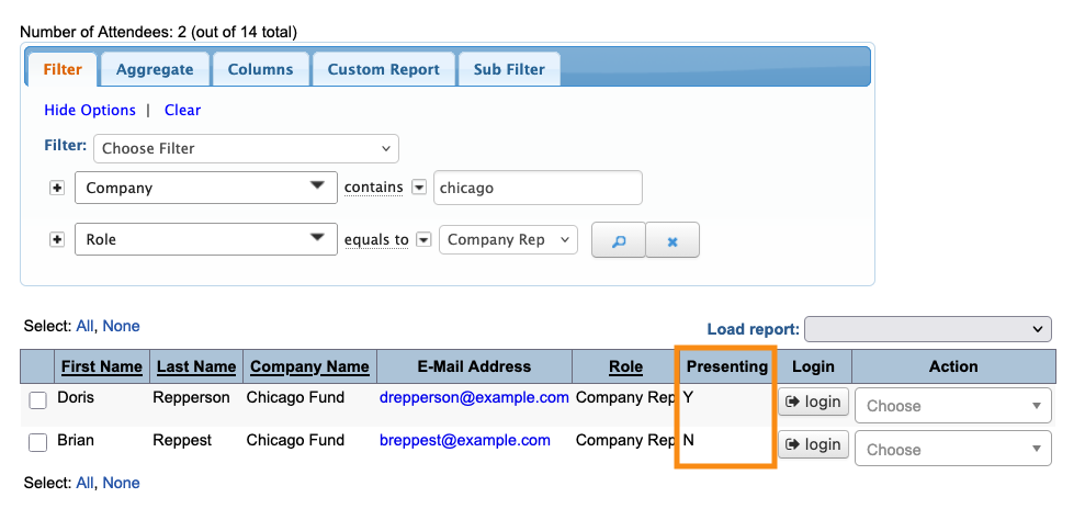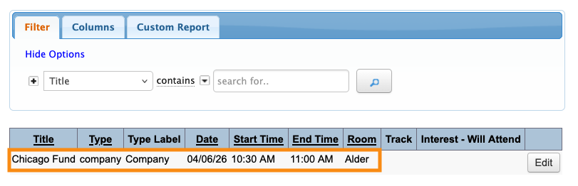 In this example, Chicago Fund has two Company Reps at our event. Here’s a filtered view of the Attendee List, where we can see them.