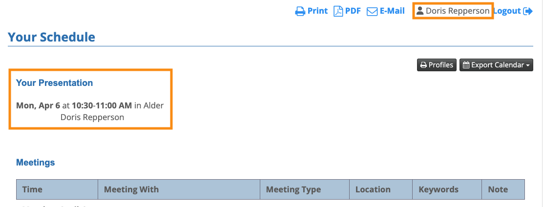 MeetMax automatically adds Doris as a presenter. When Doris logs into MeetMax to view her schedule, she’ll see it in the Your Presentations section: