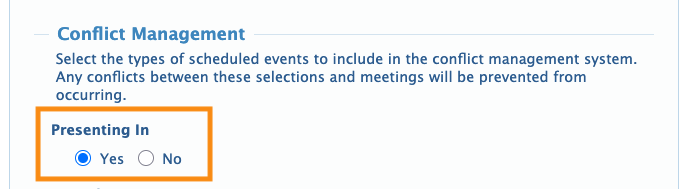 - Step 2. Scroll down to the Conflict Management section. Under Presenting In, choose Yes: